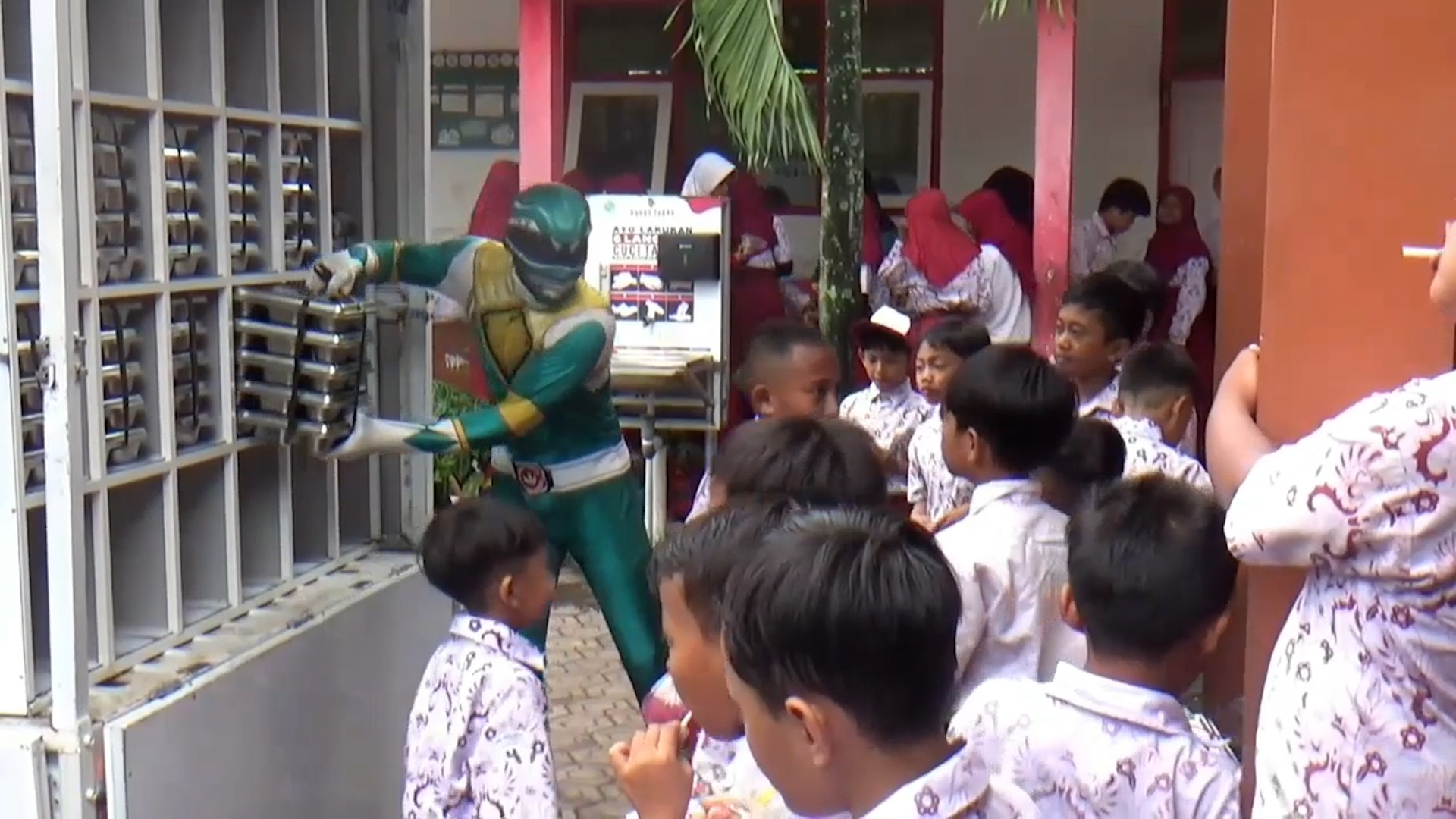 “Supaya siswa-siswa semangat menerima makan bergizi gratis dari program pemerintah ini, kami menggunakan kostum Power Rangers. Alhamdulillah responsnya sangat positif. Dibandingkan sebelumnya memakai seragam biasa, dengan kostum ini siswa lebih antusias dan lebih semangat menerima makanan,” ujarnya.