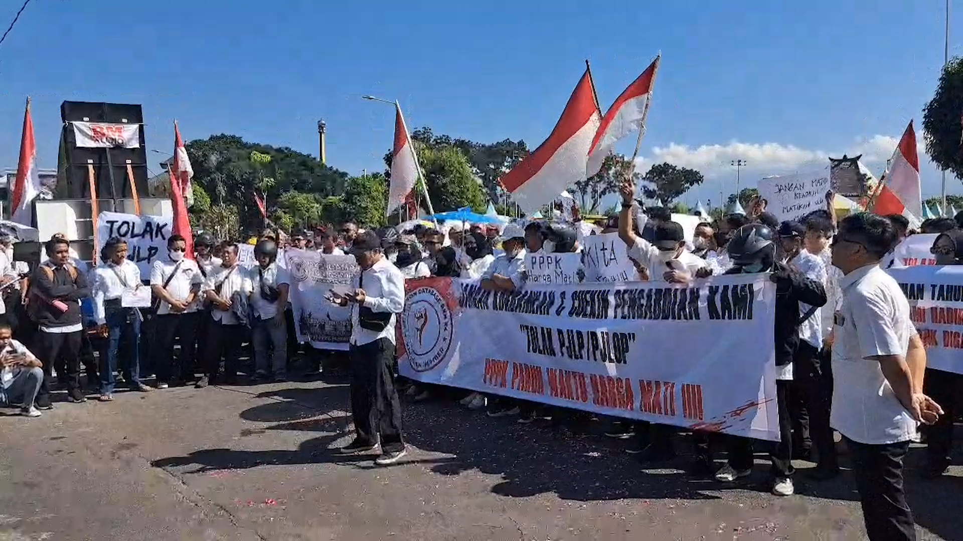 Massa aksi yang membawa spanduk tuntutan menilai, skema PJLOP yang diwacanakan pemerintah belum memiliki payung hukum yang jelas, serta belum mencerminkan penghargaan atas loyalitas para tenaga Non-ASN yang telah mengabdi hingga puluhan tahun.